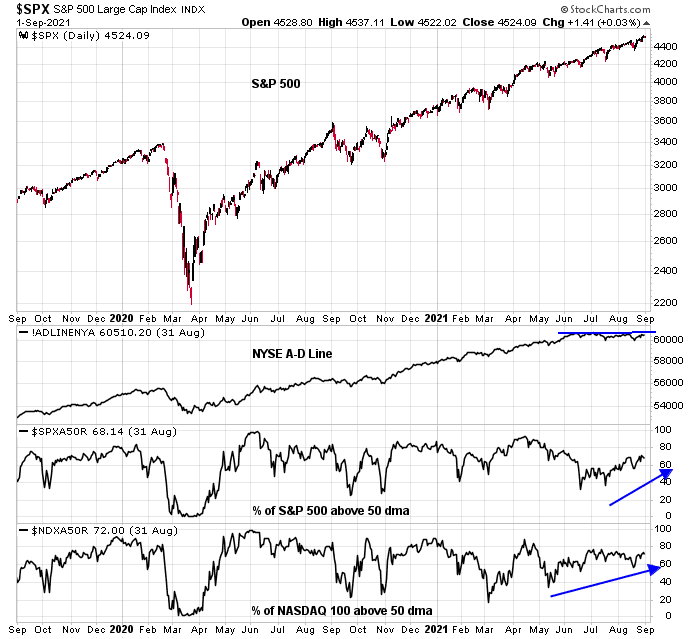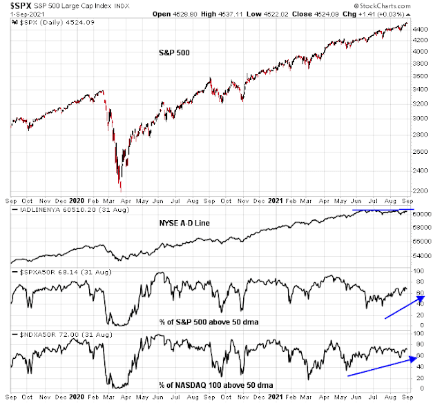 From a technical perspective, many of the negative divergences from poor internals have been improving. While the NYSE Advance-Decline Line has not made a fresh high yet despite new highs in the S&P 500, the percentage of S&P 500 and NASDAQ stocks above their 50 dma have been steadily rising.