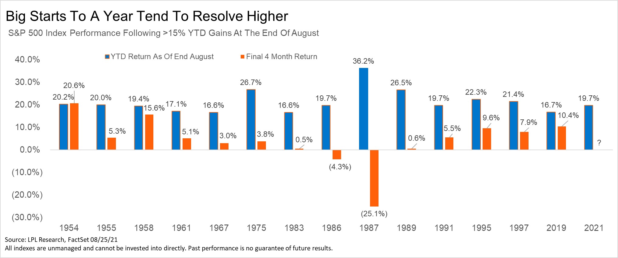 Detrick also found that whenever the S&P 500 rose 15% or more by the end of August, the rest of the year tends to have a bullish bias. Price momentum lives (notwithstanding the Crash of 1987).