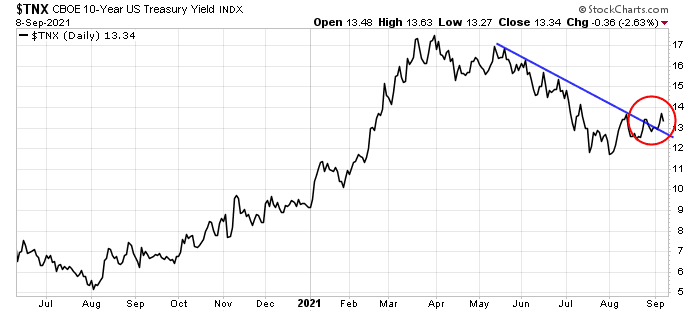 The second and more obvious breakout is an upside breakout by the 10-year Treasury yield against a falling trend line.