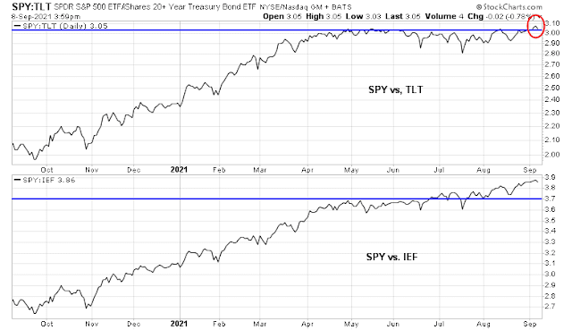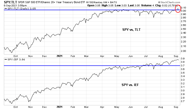 Mid-week market update: There have been two breakouts that may be of significance. The first is an upside breakout of the SPY/TLT ratio. The ratio is pulling back to test its breakout. The SPY/IEF already staged a convincing breakout in late June.