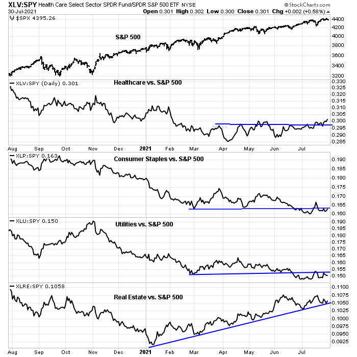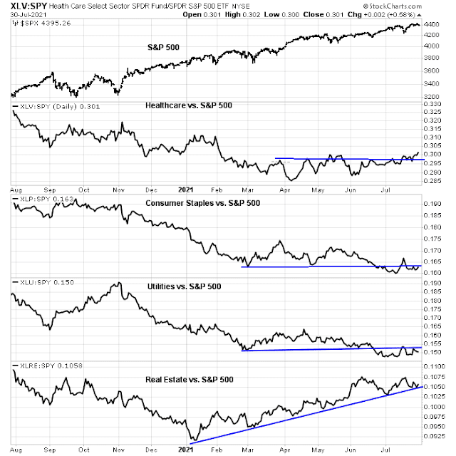 The relative performance of defensive sectors is not showing a bearish bias either. I have already highlighted the relative uptrend of healthcare, but consumer staples and utilities have not staged upside relative breakouts. Real estate had been in a relative uptrend, but the sector violated a relative uptrend and it is now consolidating sideways.