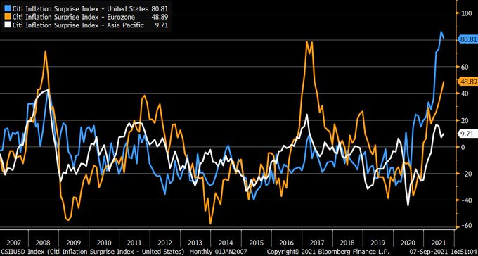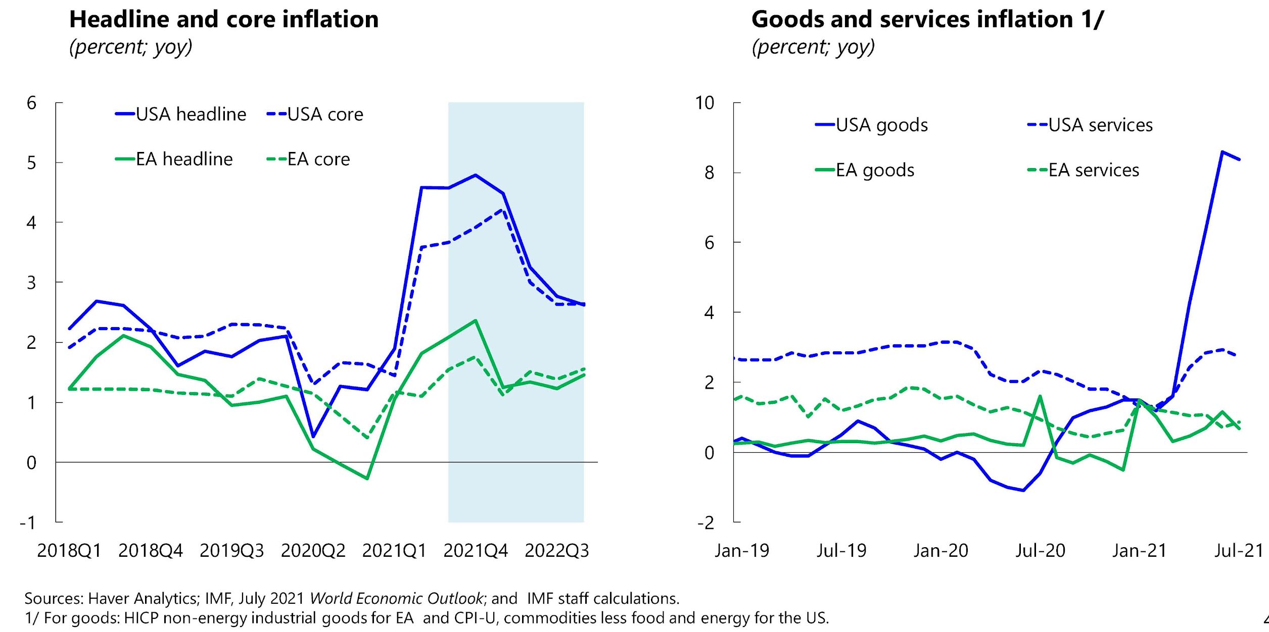 Gita Gopinath recently outlined her forecasts for transitory inflation spikes in the US and eurozone. Transitory inflation is now defined as quarters and not months. She added, “The difference between US and EA non-energy goods inflation is particularly striking (eg. used car prices).”