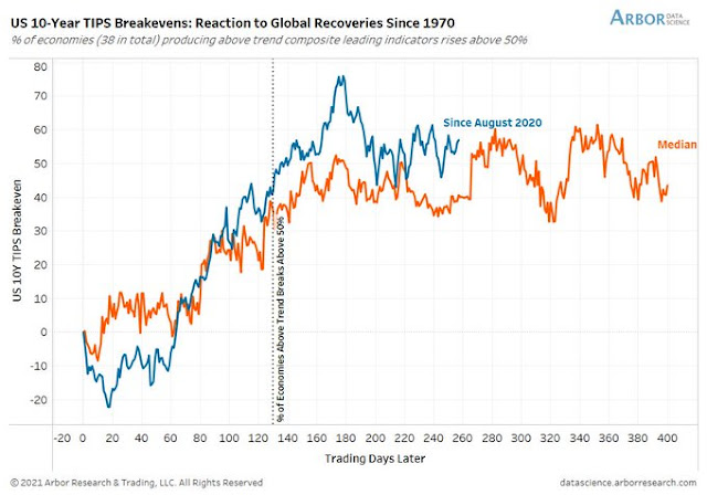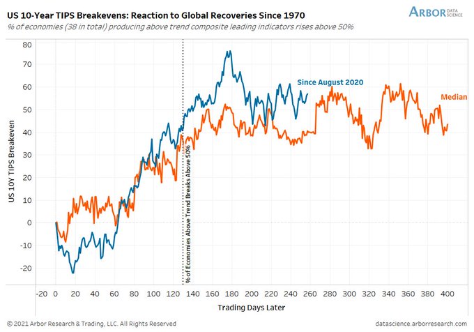 Every cycle is different, but this is also the point in the cycle when inflation expectations start to move sideways. The key difference is the determination of the fiscal and monetary authorities around the world to maintain stimulus.