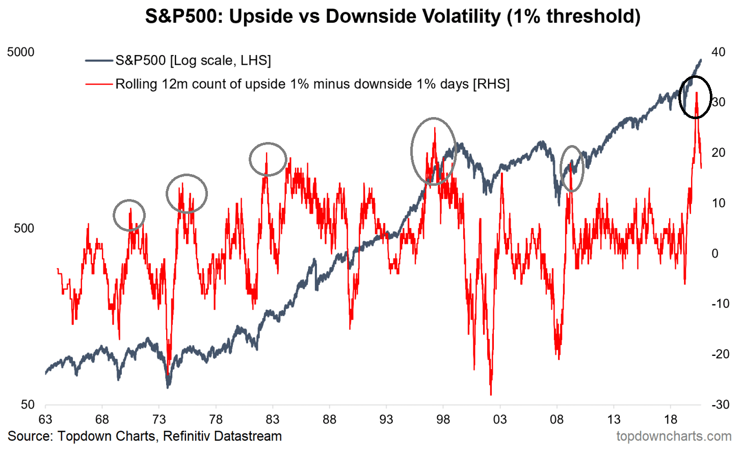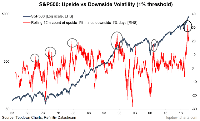 Callum Thomas at Topdown charts also studied the behavior of upside to downside equity volatility. Spikes in the upside/downside volatility ratio are the characteristic of recoveries off a recessionary bear market. It is usually resolved with either a sideways consolidation or a minor corrective phase.