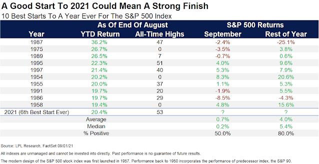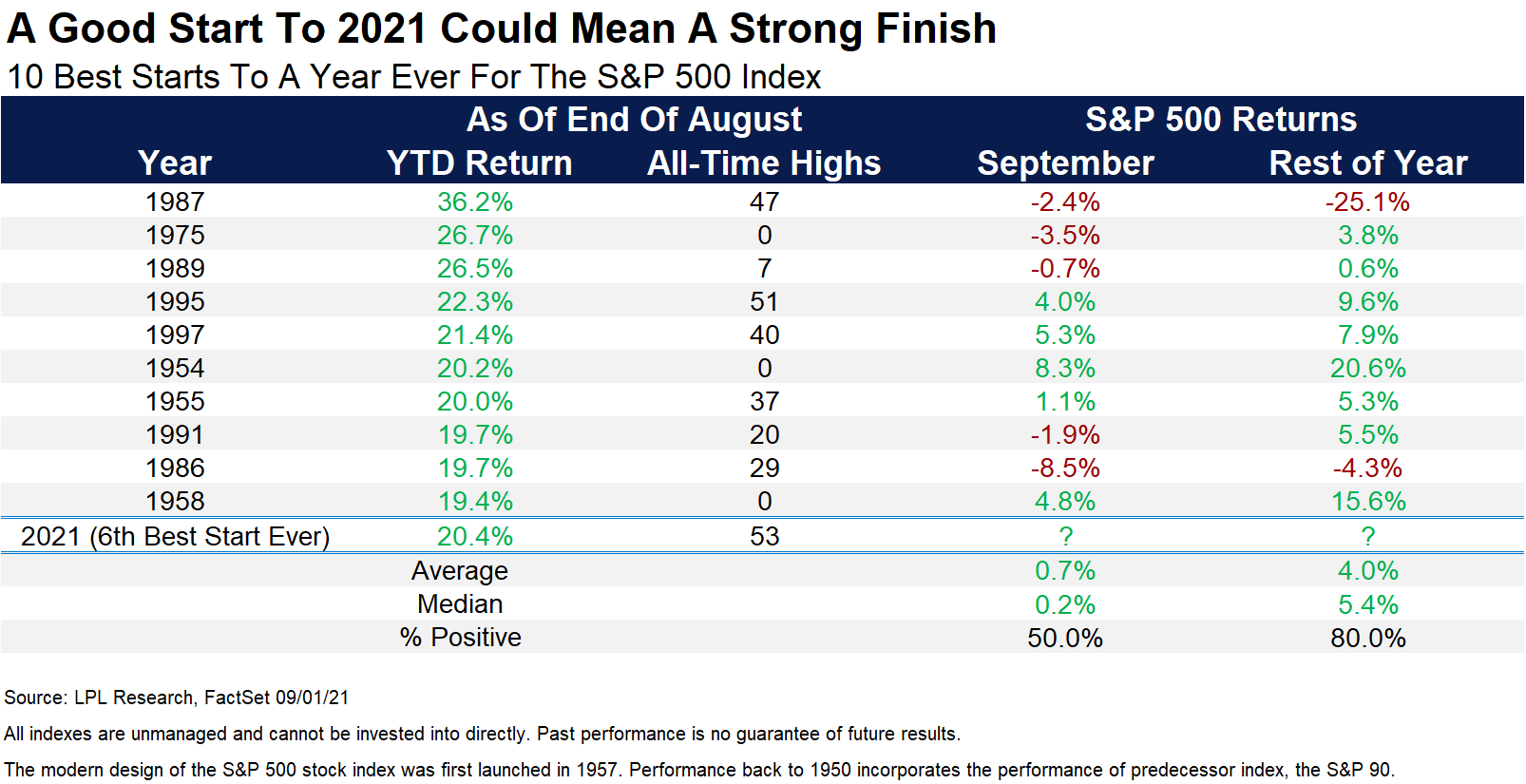 History says that great starts to a year tend to see continued strength the final four months. “Looking at the previous top 10 starts to a year ever, the final four months have gained eight times,” explained LPL Financial Chief Market Strategist Ryan Detrick. “So should we see any seasonal weakness, we’d use it as an opportunity to buy before likely continued strength.”
