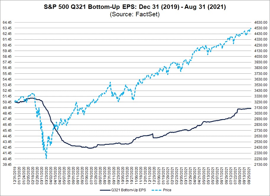 In fact, the third quarter marked the fourth-largest increase in the bottom-up EPS estimate during the first two months of a quarter since 2009. It also marked the fifth straight quarter in which the bottom-up EPS estimate increased during the first two months of the quarter. However, the third quarter is also the first quarter during this current streak in which the percentage increase in the bottom-up EPS estimate was smaller than the previous quarter.