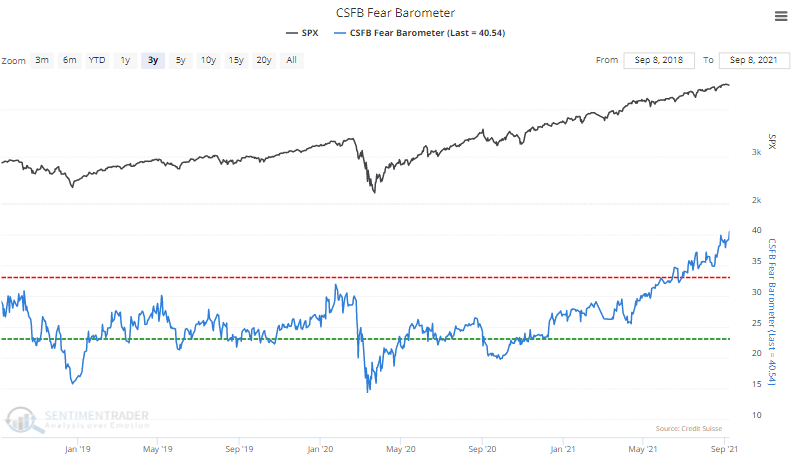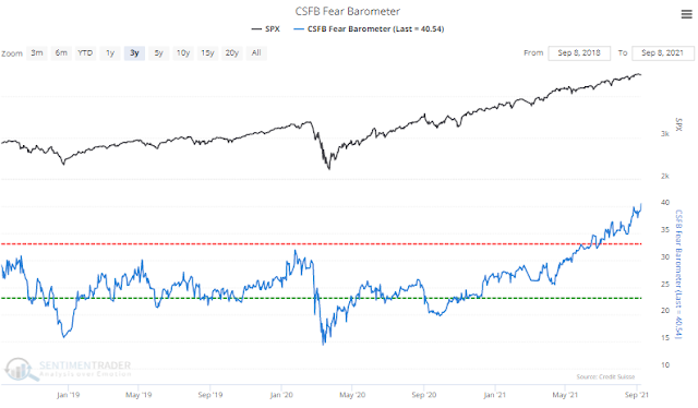 The immediate downside risk is probably limited. SentimenTrader recently observed that there is an enormous appetite for downside put protection: “A trader in S&P 500 options would have to go 40% out of the money to buy a put with the proceeds of selling a call that is only 10% out of the money. This is a sign of extreme hedging demand, the highest in several years.”