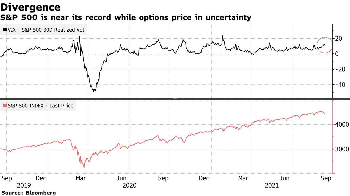 Sundial looked at what happened before when the S&P 500 was within 1% of a record and the Cboe Volatility Index’s divergence from S&P 500 30-day realized volatility was in the upper 75% of its range.
