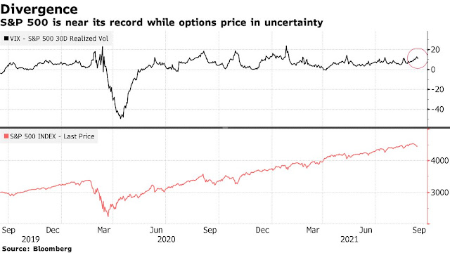 Bloomberg reported that Jason Goepfert observed a dramatic increase in nervousness in the option market. The spread between the VIX Index and realized volatility is highly elevated.