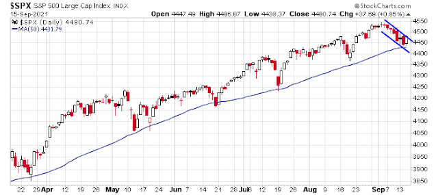 Tricky spot here, how would the market react to disappointing retail sales report? The weak readings on August economic data are not unexpected, according to what I have read August is expected to be the through. The narrative for the remainder of the year is delta peaking and some reacceleration in growth, especially in Asia. Analysts are bullish on Japan and Europe vs some expected underperformance in US megacap tech. Expectation of higher rates (bearish gold and growth stocks) going into the FOMC meeting may be a theme.