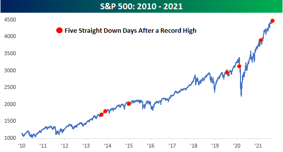 Bespoke pointed out that the most recent losing streak is just the seventh time since the GFC that the S&P 500 closed at a record high and then fell for five consecutive days. The only time the decline didn’t halt was the COVID Crash.