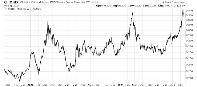 By informing banks that the interest payments due on September 20 will not be paid, an Evergrande default is imminent. That should create stresses in the financial system, right? Instead, the relative performance of Chinese financials (red dotted line) is outpacing the relative performance of US financials (black line) and European financials (green line).