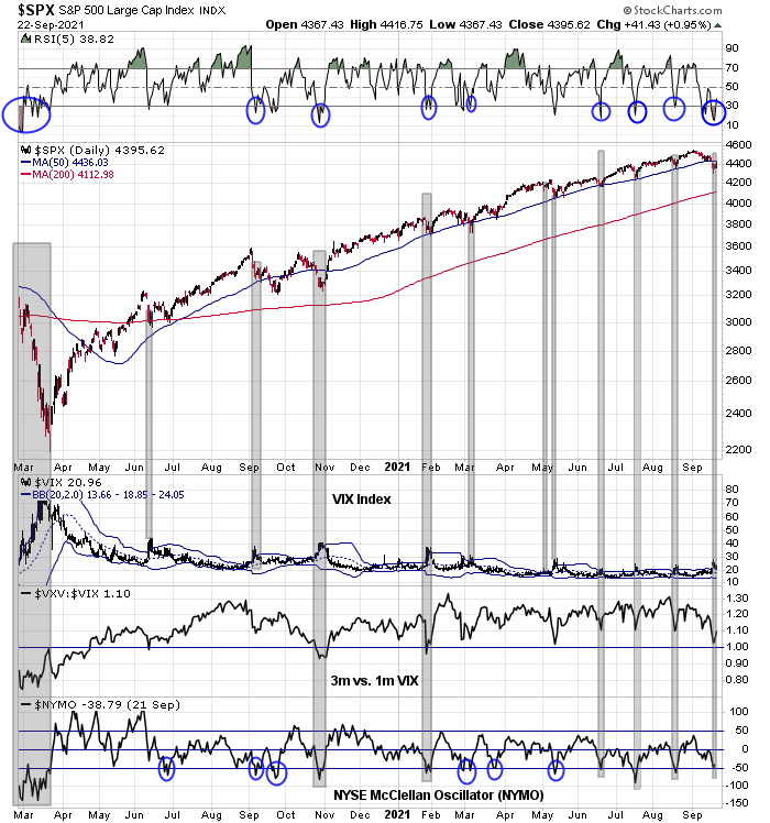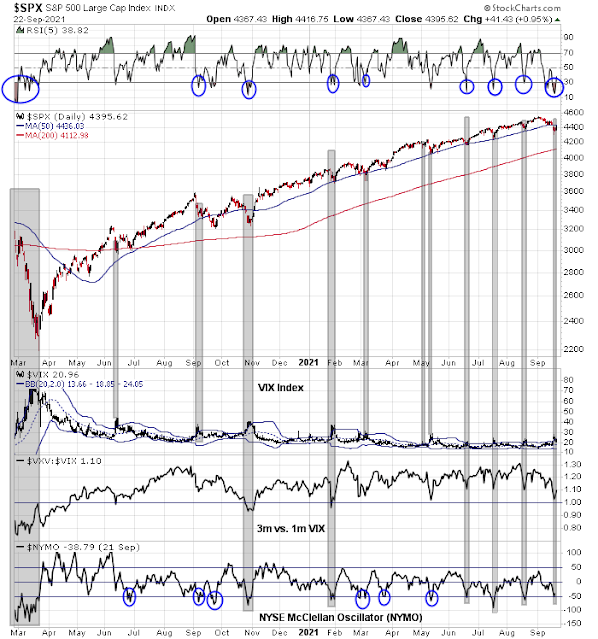 Three of the four components of my short-term market bottom model flashed signals on Monday. The 5-day RSI was deeply oversold; the VIX had surged above its upper Bollinger Band, and the NYSE McClellan Oscillator had fallen into oversold territory. The near-miss was the failure of the VIX term structure to invert, though it did briefly invert intraday Monday. Barring the appearance of further negative fundamental drivers, historically this has meant that a short-term bottom is near.