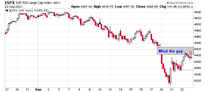 Mid-week market update: The stock market gapped down on Monday on China Evergrande contagion fears. The technical outlook darkened further Tuesday when a rally attempt failed. The markets took on a risk-on tone this morning when Evergrande issued an ambiguous statement that a coupon due on its yuan-denominated bond. An agreement had been reached with its lenders but the statement didn’t specify the nature of the payment, or when it would be paid.