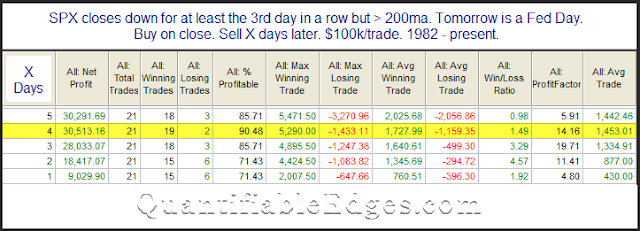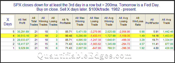 Quantifiable Edges also found that a three-day consecutive decline into an FOMC day has historically resolved bullishly.