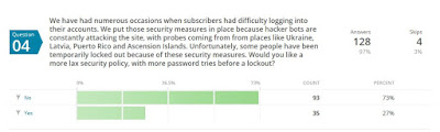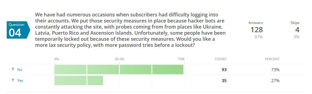 As promised, here are the results of the subscriber poll conducted last week. We received 134 responses. Even though that represented a fairly small sample, it was adequate to get some good solid feedback on the site.