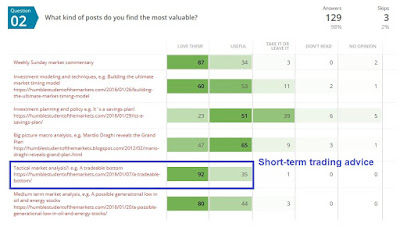 Question 2: This was a surprise to me. The demand for short-term trading insights was much higher than I thought. I had expected a greater affinity for the big picture and mix of fundamental, macro and technical analysis that had been a signature of my weekend posts.